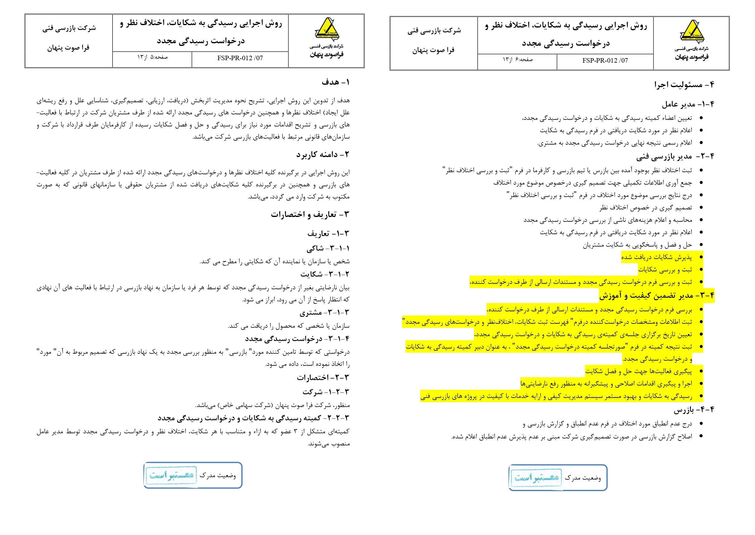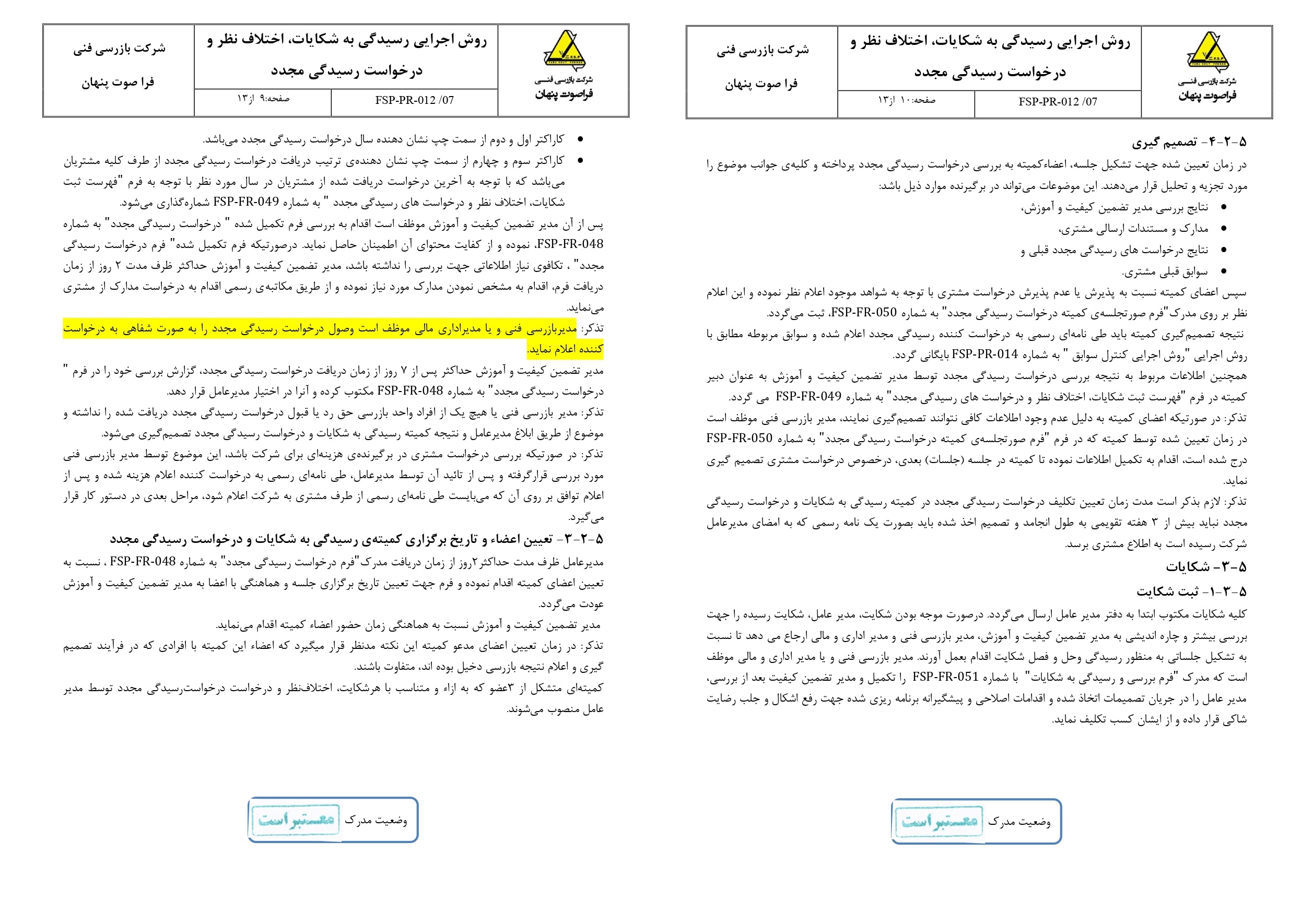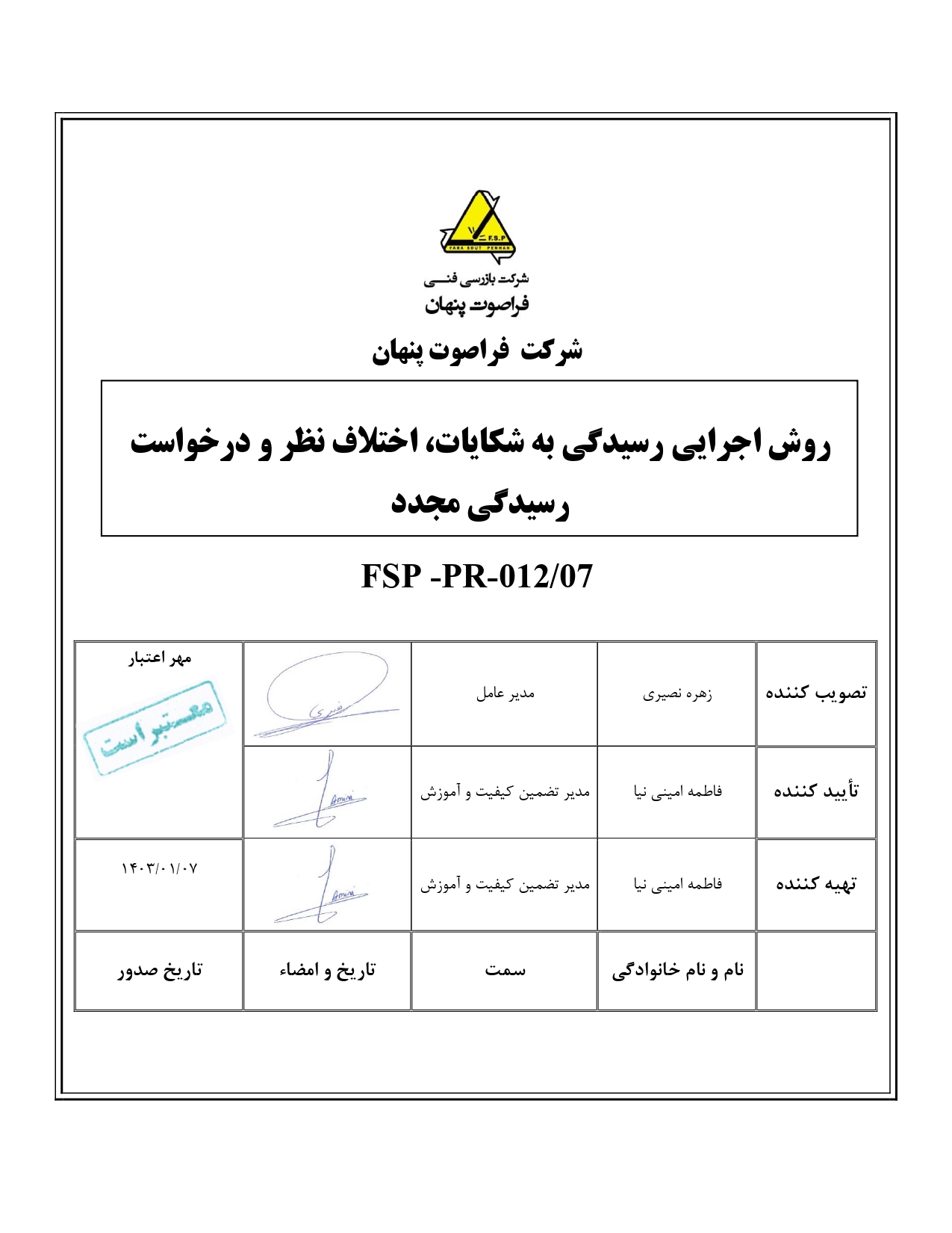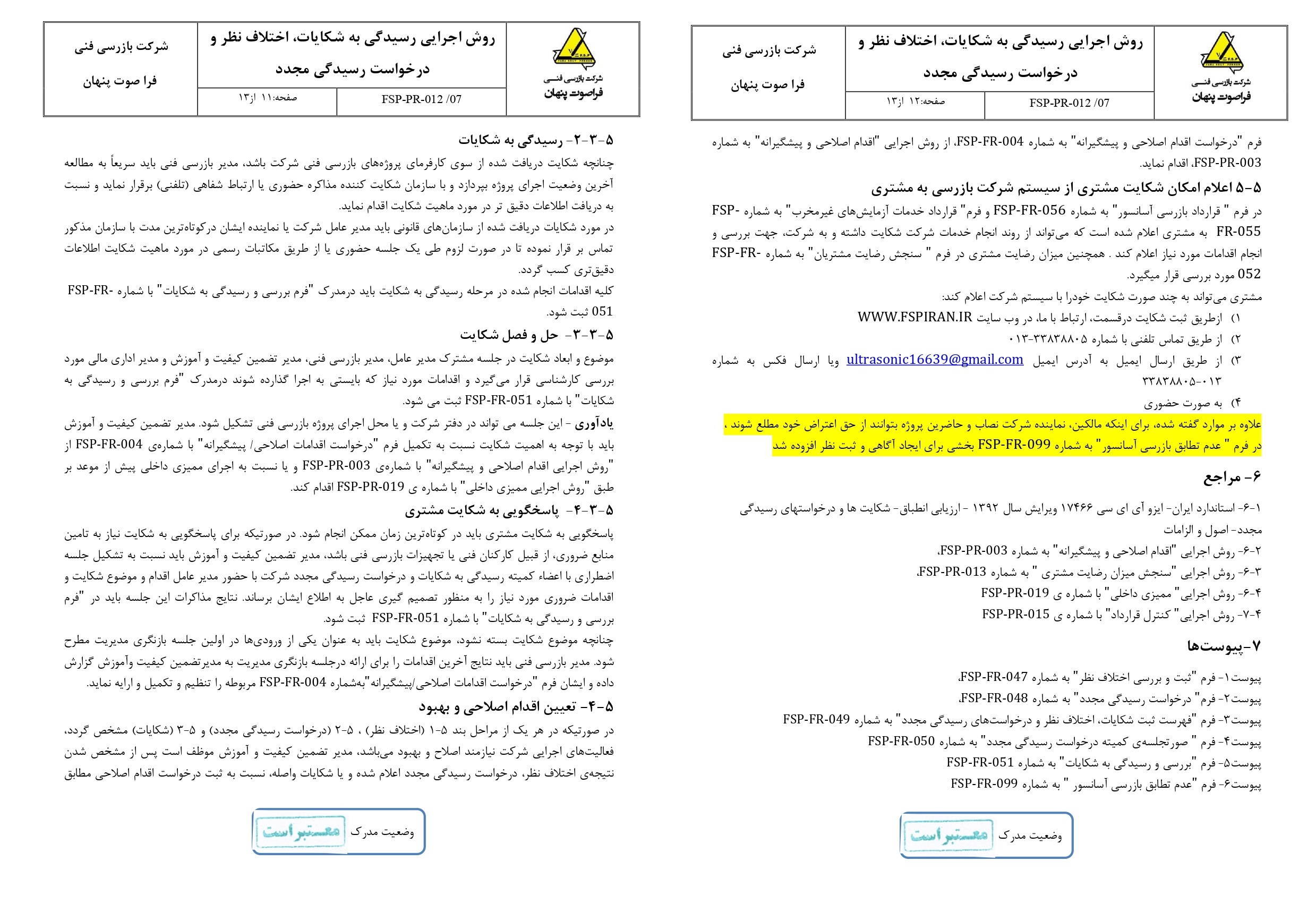 نحوه ثبت شکایت مشتریان 1) از طریق ثبت شکایت در قسمت ، ارتباط با ما، در وب سایت WWW.FSPIRAN.IR 2)از طریق تماس تلفنی با شماره 33838805-013 3)از طریق ارسال ایمیل به آدرس ایمیل [email protected] و یا ارسال فکس به شماره 33838805-013 4)به صورت حضوری